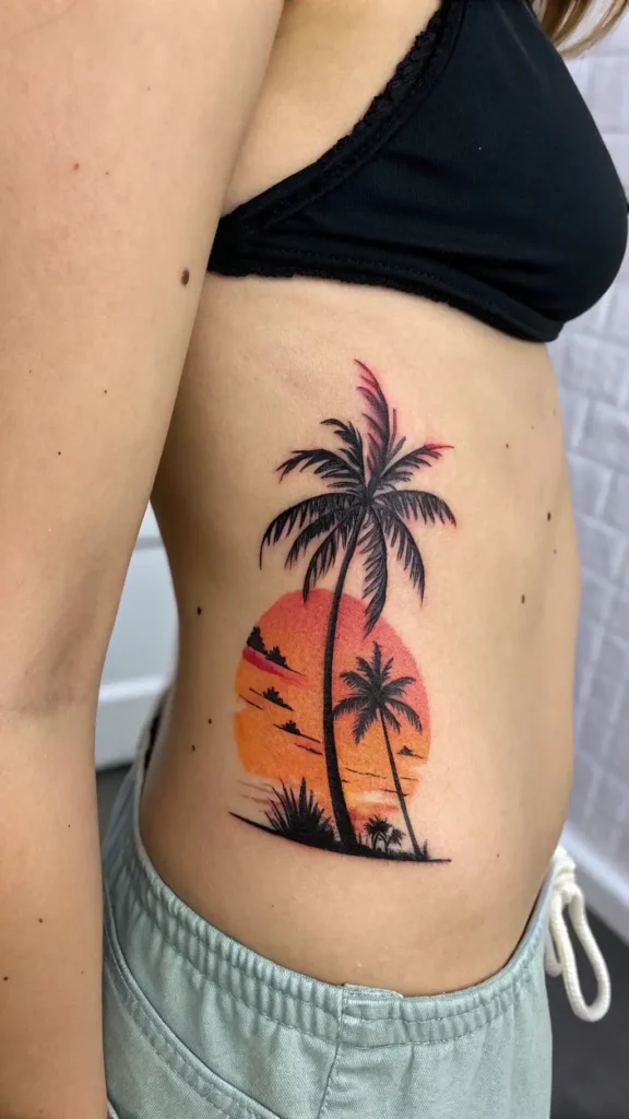 Imagine the silhouettes of palm trees against vibrant oranges, pinks, and purples of a setting sun—each color reminding you of warm summer nights and cherished memories. A palm tree and sunset tattoo can serve as a personal emblem, representing your love for adventure and the beauty of nature.