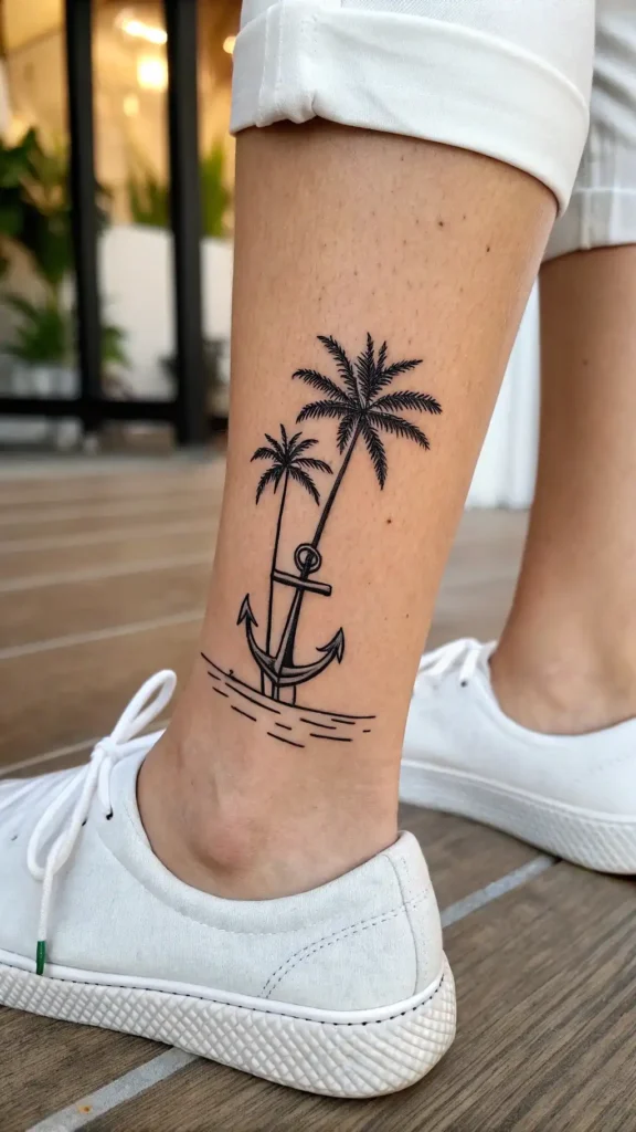These tattoos capture the essence of tropical vibes with clean lines and simple shapes. You can express your love for the beach and nature without overwhelming detail. A tiny palm tree on your wrist or a delicate silhouette on your ankle can add a touch of elegance to your look.